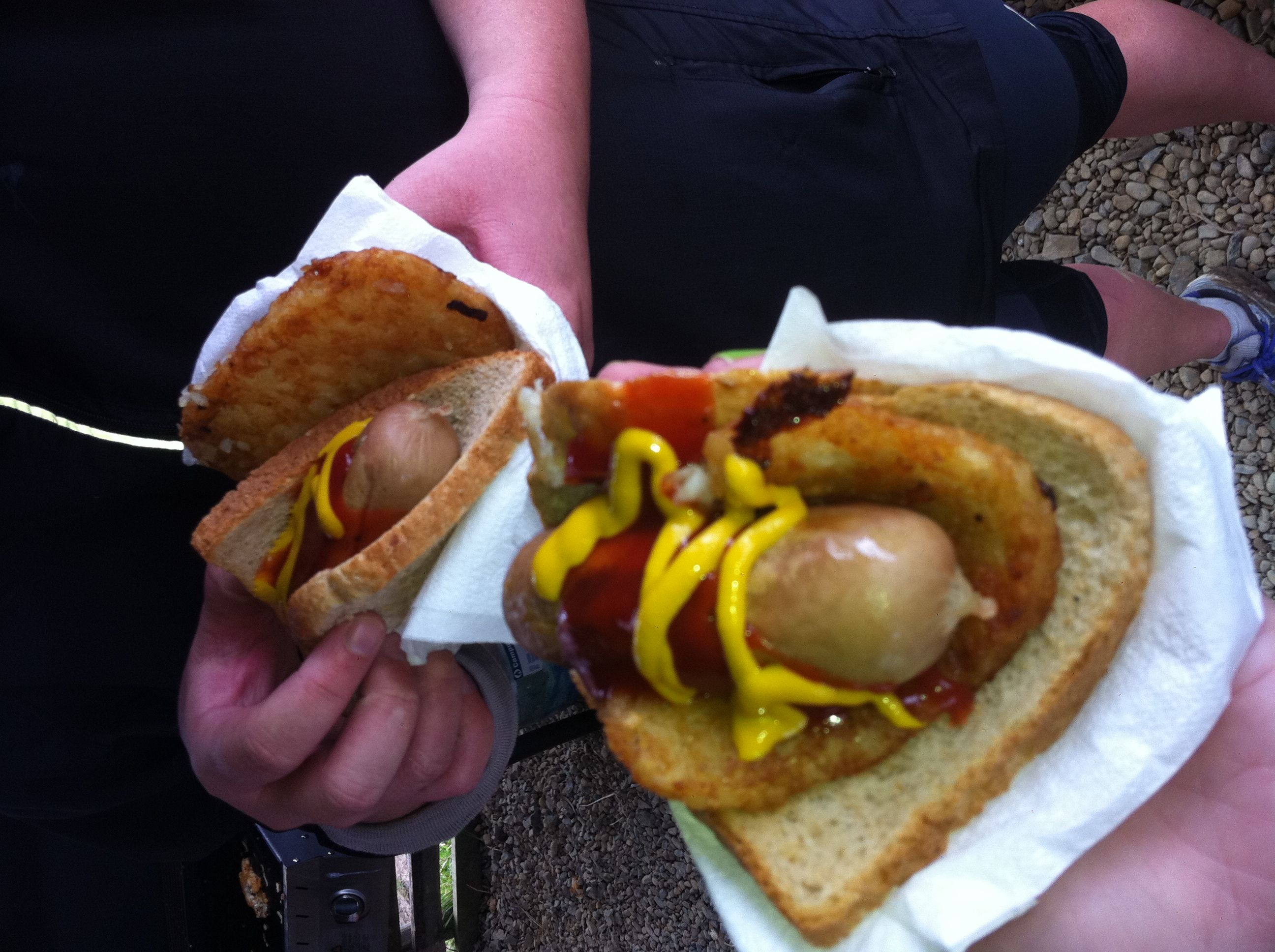 post-run sausage on bread and hash brown